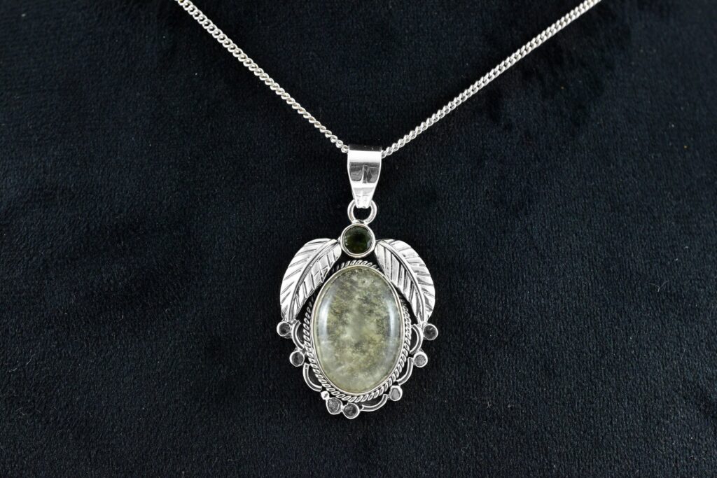 Moldavite and Libyan Dessert Glass Pendant – Floral theme Sterling Silver Pendant, Genuine Moldavite, Czech Republic Moldavite Jewelry