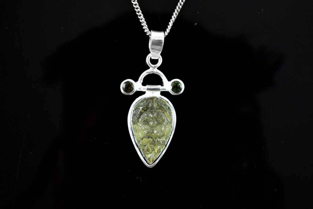 Moldavite Pendant with Libyan Dessert Glass Carving, Faceted Moldavite, Handmade Sterling Silver Pendant, Christmas gift, Heart Chakra